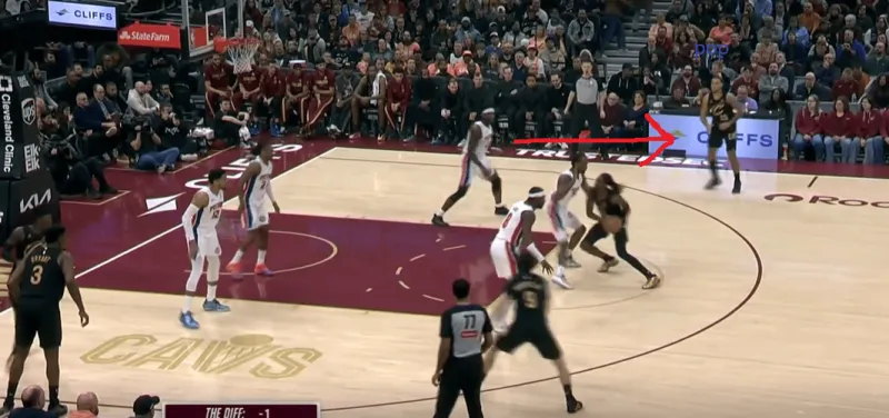 以更纯粹的形态作为空间点时,泰森也有很好的重新落位接应意识:施罗德持球突破走底线,泰森从上线向底角移动接应,利用坎宁安面对持球人的防守方式短暂抓住半空位出手机会: